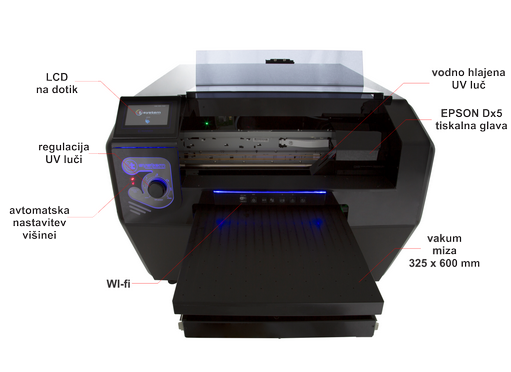Sam tiskalnik sicer meri 930 mm v dolžino, 740 mm v širino in 530 mm v višino. Tiska do resolucije 5760 x 1440 dpi, kar omogoča resnično kvaliteten odtis. Maksimalna velikost tiska je 300 x 500 milimetrov. Z njim lahko potiskate vžigalnike, koledarje, pisala, rokovnike, dežnike, nalepke, usnje, aluminij, steklo, plastiko, les … Omogoča tudi UV DTF tisk nalepk. Opremljen je z 8-barvno Epson DX5 tiskalno glavo (CMYK + 2-krat bela + 2-krat sijaj lak opcijsko po želji pa lahko 4 bele namesto laka), ima regulacijo moči UV led luči, ki je vodno hlajena za daljšo življenjsko dobo … Tiskalnik vse barve samodejno pretresa (te funkcije nima nihče od konkurence), obenem pa poskrbi za kroženje bele barve, tako da ni težav z mašenjem tiskalne glave in dosegom optimalnega učinka … Višina tiskanja se nastavi samodejno. Pri višini predmeta, ki ga želite potiskati, ste omejeni na 130 milimetrov. Poskrbeli smo tudi za enostavno upravljanje, saj se zavedamo, da je danes uporabniška izkušnja tista, ki šteje dvojno. Zato smo tiskalnik opremili z LCD zaslonom na dotik, meni pa je na voljo v slovenskem, hrvaškem in angleškem jeziku. Dokupite lahko razne nastavke, ki vam omogočajo tisk na ovalne predmete, nosilne vrečke, koledarje … S povezljivostjo ne boste imeli težav, saj je tiskalnik UV led TT system 3050 opremljen tudi z Wi-Fi, mrežno in USB povezavo. Katero boste izbrali, je torej samo vaša odločitev, možnosti pa kar nekaj. Tiskalnik ko ga ne uporabljate je lahko ugasnjen in ne troši barve ...